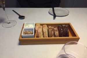 Für diesen Zwischengang (und auch als Zwischenhäppchen danach) waren die dazu gereichte leicht gesalzene Butter und der Steinpilzfrischkäse eine willkommene geschmackliche Bereicherung. Für die Aufnahme der letzten Tröpfchen flüssiger Ingredienzien der nachfolgenden Gänge, die sich dem immer vorhandenen Saucenlöffel verweigerten, war das Brot ein perfektes Werkzeug und ein passender Geschmacksträger im wahrsten Sinne des Wortes.