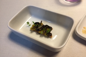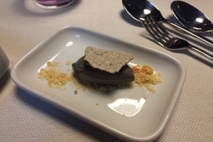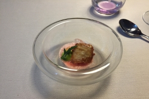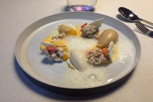 Zum Essen bleiben wir immer noch am Meer: Elegant räkelt sich die Garnele auf einem Estragonschaum und wird vom Rande aus von Karottenscheiben und -röllchen beäugt. Hauchdünne Scheiben von Karotte umschlossen das Garnelengelee und das Karotten-Anis-Sorbet lag auf einem Bett von weißen Olivenkrümeln … Der Estragonschaum ruft förmlich nach Einsatz des dazu gereichten Brots, damit auch ja nichts von dem leckeren Schaum in der Spülmaschine landet.