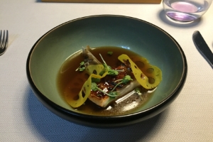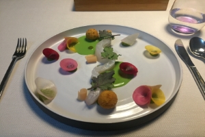 Hinter den minimalistisch angegebenen Zutaten auf der Speisekarte verbarg sich ein gebeizter Kabeljau (sozusagen ein nicht bereits in der Küche in Scheiben geschnittenes Sashimi) auf einer Petersilie-Buttermilch-Sauce mit Stockfischkroketten und Räucherfischsauce (also eine Gourmetvariante der nicht nur bei Kinder beliebten Fischstäbchen) und einem abwechslungsreichen Wintergemüse-Carpaccio in begeisternder Farb- und Formvielfalt … Diese Kombination (einschließlich des Weins) weckt die Erinnerung an Meer und auch den Wunsch nach mehr.