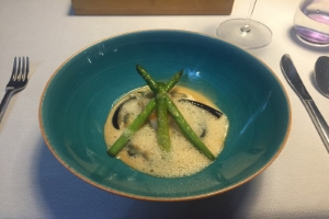 Auf dem Teller findet sich (wie bereits erwähnt) der Schaum des Thaicurrys, für dessen rückstandslosen Genuss (wie ebenfalls bereits erwähnt) das dazu gereichte Brot ein Muss ist, und auf dem die Jakobsmuscheln und der Bauch des iberischen Schweins (davon hatten wir es ja auch schon) angerichtet sind. In der Sauce fnden sich noch Thai-Auberginen und als Krönung des Ganzen gibt es noch etwas Grünspargel in gekonnter Lässigkeit auf allem drapiert … Ein gelungenes Gesamtkunstwerk.