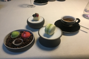 Den endgültigen Abschluss mit einer Tasse Espresso und einem Gläschen Glennfiddich bzw. Calvados versüßte uns die Pâtisserie des Hauses mit ein paar leckeren Kleinigkeiten: Ein Macaron, ein kleines Stückchen Käsekuchen und dreierlei Pralinen (Marshmallow, Baileys und ein kleiner asiatischer Kohlkopf) ließen nochmals die Erinnerung an jede Minute dieses wunderschönen und gelungenen Abends aufleben. Vielen Dank an alle, die zu diesem außergewöhnlichen Genuss beigetragen haben!