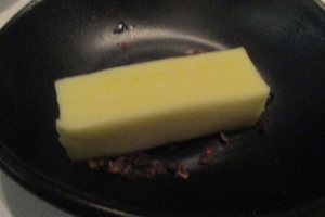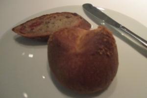 Zum Aperitif und auch während des gesamten Menüs gab es Brioche und Cranberry-Brot, beides von David Seboek, einem gelerntem Bäcker, höchstpersönlich gebacken. Dazu gab es eine dezent gesalzene Butter mit geschroteten Kakaobohnen.