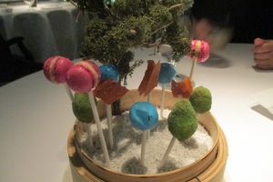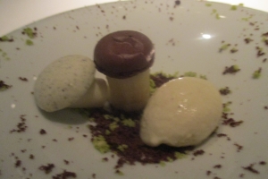 Der Zwischengang entführte uns in die Pilzwelt des Waldes: Ein Tofupilz mit Trüffel, ein Eis vom Ziegenkäse und ein Ziegenkäsestengel, der der Macaronhaube Halt gab. Dazu ein italienischer »Fattorie Melini San Lorenzo Chianti« aus 2017.