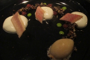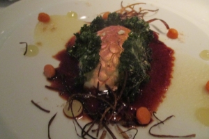 Die geschmacklich überaus reizvolle Kombination aus dem säuerlichen Sorbet von Drachenfrucht und Apfel mit einem ausgewogenen, in sich ruhenden, Räucheraal auf Joghurtschaum und Quinoa auf einer Chardonnay-Vinaigrette hatte dem Somemelier einiges Kopfzerbrechen bereitet. Nach einigen Experimenten und Ausflügen auch nach Frankreich landete er schließlich bei dem bereits beim Aperitif beschriebenen »Kreinbacher Prestige Brut Classic«. Für die beiden bei der Vorspeisenwahl altersentsprechend gemächlicheren GenießerInnen war es ein glücklicher Umstand, dass ihre Aperitifwahl diese Vorspeisenwahl quasi vorwegnahm, so dass es keine ansonsten vom Sommelier zu umschiffende Wiederholungsgefahr gab.