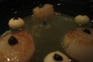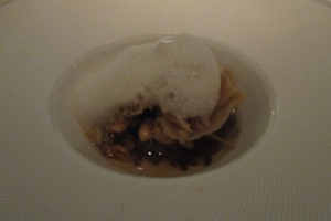 Der sich unter der Glashaube sammelnde Rauch der geräucherten Wachtel, der sich nach Abheben der Haube in die Nase und gleichzeitig kranichgleich in die Lüfte erhob, war eine überaus einfallsreiche Inszenierung der diesem Gang zugrunde liegenden Geschichte. Auf dem Teller fand die Wachtel die Gesellschaft von Blumenkohl, luftigen grünen Oliven, Kaviar vom Cassis und einer Bisque vom Riffhummer.
