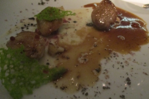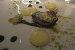 Die Foie Gras, serviert mit etwas Grünspargel und einem säuerlichen Schaum vom Fruchtfleisch des Kumquat, garniert mit pulverisiertem Grüntee (Matcha) und auf die Leber gehobeltem gefrorenen Spargel wurde begleitet von einem dieser gefährlichen Schönheit angemessenen Süßwein, einem eleganten Tokajer: »Balassa 6 Puttonyos Villő Aszú« Jahrgang 2013, eine überaus sanfte Landung der Achterbahnfahrt.