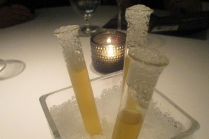 Bevor es nun unaufhaltsam zum endgültigen Dessert geht, gibt es noch einen chinesischen Baijiu, mit Tee aromatisiert und im Reagenzglas serviert: ein leckerer Schluck!