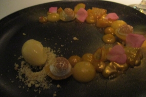 Eine elegante Komposition versteckten Goldes: Süße japanische Wollmispel (Loquat), Ananas, Aprikose, Melone und die elegante Säure der Passionsfrucht. Dazu passend die Süße des »Dobogó 6 Puttonyos Aszú« aus dem Jahrgang 2009.