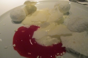 Verführerisch und jeden Widerstand im Keim erstickend: Meringe von der Kokosnuss mit »Frozen Yogurt« und einem der Süße etwas Einhalt gebietenden Zitronenschaum. Dazu eine Consommé von der Blutorange: Auf ewig dein!