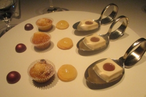 Zum Abschluss dieses wunderbaren Abends verwöhnt uns die Küche noch mit ein paar süßen Kleinigkeiten: mit Cranberry überzogene Schokolade, Rosinen-Muffins, kleine Apfelküchlein und Birnen-Panna-Cotta.
