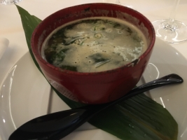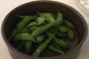 Für die Nicht-Vegetarier gab es zu Beginn eine Miso-Suppe mit Seiden-Tofu und Hummersud. Die vegetarische Variante des Auftakts waren Edamame mit einem Misosalz. Dazu gab es einen Silvaner aus dem Weingut »Klaus-Peter Heller« in Rheinhessen, der dem Hummergeschmack in der Miso-Suppe zum endgültigen Durchbruch verhalf.