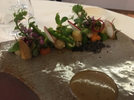 Als vegetarische Variante des Feuerwerks an Vorspeisen gab es einen »Gemüsegarten« aus verschiedenstem blanchierten Gemüse an Yuzu-Sauce und etwas Sesamsand.