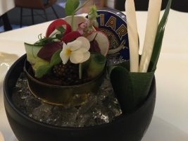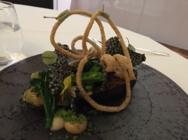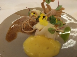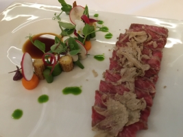 Für die Allesesser gab es ein Trio aus einem Sashimi vom Wagyu-Rind mit weißem Trüffel und einem Gemüsegärtchen, dazu ein Thunfisch-Carpaccio mit Kaviar und getrockneten Zwiebeln, sowie Röllchen von der Gänseleberterrine, umhüllt mit Rote-Bete-Krokant und begleitet von feinstem Haselnuss-Pulver.
