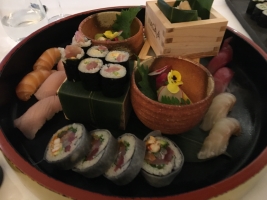 Für die beiden Nicht-Vegetarier gab es eine mit Trockeneis gekühlte Sushi- und Sashimiplatte vom Feinsten: Sushi von fünferlei Fisch, dazu Thunfischsashimi und dreierlei Rolls.