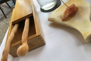 Dazu kam auch noch die Brotbegleitung des Abends: Ein mit Steinpilzmehl gebackenes Brot, von der lokalen Bäckerei »Bulle« eigens und nur für das Restaurant gebacken, mit Zitronen angesetztes Olivenöl und Meersalz aus Sizilien sowie handgeschöpfte Butter aus dem Treviso.