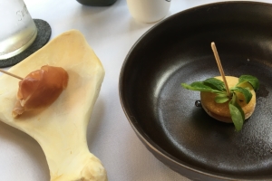 Der kleinen Ouvertüre folgt das eigentliche Amuse-Geule: Eine San-Marzano-Rolle gefüllt mit Entenleber und Spitzkohl und begleitet von einem Fenchelchip; etwas Brathähnchen vom Blaufußhuhn mit einem Parmesanchip und Veilchen; ein Guanciale-Tartelett mit Aal.