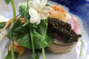 Der erste Gang wurde von einem Chardonnay 2018 aus dem Weingut Robert Schätzle Schloß Neuweier eingeleitet und begleitet. Dazu gab es eine Hummer-Auberginen-Rolle mit Kohlrabi, Rote Bete und Schrenckiikaviar, umspielt von einer kunstvoll angegossenen Kohlrabi-Kräuter-Vinaigrette.