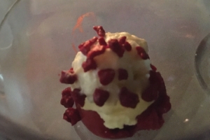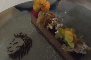 Zum Dessert gab es eine Schokomousse von der Valrhona-Schokolade mit Himbeergelee und ein Himbersorbet mit etwas Balsamico. Dazu passte bestens der gereichte Vintage-Port »Galem«, Jahrgang 2015.