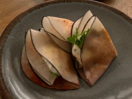 Zum Aperitif gab es einen Rosé brut vom Sekthaus Burkhardt Schür und einen alkoholfreien Traubensecco. Die flüssige Begrüßung wurde begleitet von einer knusprigen Komposition aus Frischkäse, Kerbel, Rettich – crisp und von angenehmer Schärfe.