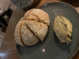 Dazu gab es noch ein Dinkel-Kartoffelbrot der Bäckerei Lang mit einer Kürbiskernbutter zur Einstimmung auf die folgenden Gänge unseres Menüs und natürlich auch zu deren Begleitung.