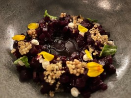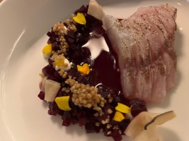 Zum ersten Gang gab es einen gebeizten Zander, dessen Begleitung – Rote Beete, Senfsaat und knusprige Quinoa – auch als vegetarische Variante dieses Gangs überzeugen konnte. Perfekt darauf abgestimmt war ein fruchtiger Riesling mit harmonischer Säure Ried Loiserberg vom österreichischen Weingut Loiser aus dem Kamptal. Die alkoholfreie Begleitung war eine ebenso passende Ingwer-Zitronen-Limonade.