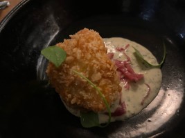 Dem gelungenen Auftakt folgte ein kross-paniert gebackener Blumenkohl mit gepickeltem Rotkohl und einer Sauce Tartare, begleitet von einem dezent mineralischem und elegantem Sulzfeld Berg Weißburgunder Erste Lage aus dem Weingut Zehnthof-Luckert in Sulzfeld, Franken.