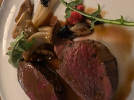 Die vegetarische Variante des Hauptgangs zeigte sich als Gnocchi mit Rosenkohl, gepickelter Birne und Taleggio-Käse. Für die Fleischesser:innen gab es ein Filet vom Hirschkalb mit Schwarzwurzel, schwarzem Knoblauch, Preiselbeeren, Pilzen und Pfefferrahm. Für eine stimmige Begleitung des Hirschkalbs sorgte ein Manincor Réserve del Conte aus Südtirol, ein harmonisches Cuvée aus Cabernet, Lagrein und Merlot.