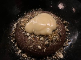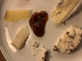 Zum Ausklang gingen die Geschmäcker etwas auseinander und die Wahl fiel auf ein süßes Schokofondant mit Kürbiskern und der nordamerikanischen Variante des Eierlikörs: einem Eggnog. Dazu passend gab es einen roten Portwein Quinta de la Rosa für die Dame. Die Herren entschieden sich für eine Käseauswahl der Käseecke Waltmann in Erlangen, begleitet von einer Riesling Auslese aus dem fränkischen Weingut Störrlein-Krenig bzw. einem alkoholfreien Gin Tonic.