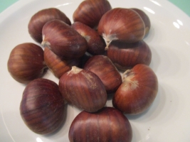 Zum Schälen von Esskastanien oder Maronen die Schale auf der gerundeten Seite mit einem scharfen Messer kreuzweise einritzen. Danach etwa 1½ Stunden in kaltem, leicht gesalzenen Wasser einweichen. Die Kastanien mit der flachen Seite auf ein mit Backpapier ausgelegtes Backblech geben und im auf 180°C vorgeheizten Backofen ungefähr 25 Minuten rösten bis die Schale aufplatzt. Dabei eine ofenfeste Schale mit Wasser in den Backofen stellen. Die Kastanien noch heiß mit einem kleinen scharfen Messer schälen und die Haut mit einem Küchentuch abreiben.