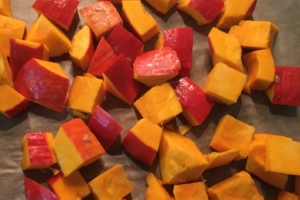 Den Kürbis waschen, halbieren und entkernen. In Stücke schneiden und auf mit Backpapier ausgelegte Backbleche geben.