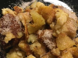 Die Butter in einer mittleren Pfanne erhitzen, die Teigmasse hineingeben und die Apfelspalten darauflegen. Von beiden Seiten ausbacken. Danach in der Pfanne zum »Schmarren« zerrupfen.