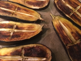 Die Auberginen der Länge nach halbieren und kreuzweise einschneiden. Mit der Schnittfläche nach oben auf ein Blech legen, mit Olivenöl beträufeln und mit Salz würzen. Auf mittlerer Schiene im auf 230°C vorgeheizten Ofen backen, bis sie sehr weich sind und auch (ruhig kräftige) Bräune angenommen haben.