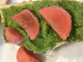 Das Radieschengrün mit dem Olivenöl pürieren. Danach Mandeln, Knoblauch, Parmesan und Zitronensaft zugeben und weiter pürieren, bis eine glatte, sämige Paste entsteht. Mit Salz abschmecken.