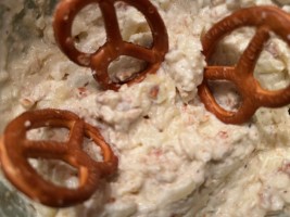 Die Salzbrezeln in einer Plastiktüte mit dem Nudelholz zerkleinern und unter die Aufstrichmasse rühren.