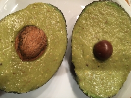 Die Avocado halbieren, entkernen und mit einem Löffel vorsichtig das Fruchtfleisch entfernen. Die Avocadohälften beiseite legen. Die Walnüsse halbieren und die Kerne auslösen. Die Walnussschalen ebenfalls beiseite legen. Alle Walnusskerne im Blitzhacker fein hacken.
