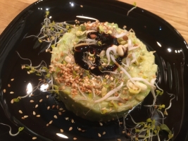 Die Masse in Servierringen auf einen Teller geben. Zum Servieren die Ringe entfernen, mit Sprossen und geröstetem Sesam bestreuen und mit Crema di balsamico garnieren.