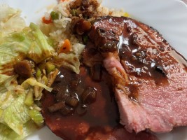 Aus dem Miso, der Sojasauce und dem Sake eine klumpenfreie Masse rühren und auf Stufe »Low« in einen Slow-Cooker geben. Den Pökelbraten darin wenden und sechs Stunden garen. Alle 60 Minuten den Braten mit der Sauce bestreichen.