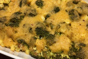 Die Kartoffeln schälen und in Würfel schneiden. Den Brokkoli waschen, die Röschen abtrennen und kurz blanchieren. Den Backofen auf 180°C vorheizen und eine Auflaufform mit Margarine einfetten.