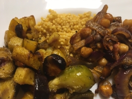 Den Rosenkohl putzen, die Enden abschneiden und halbieren. Pastinaken und bunte Rüben würfeln und das Gemüse mit Olivenöl, Currypulver, Salz und Pfeffer vermischen.