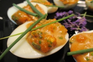 Die ausgekühlten Eier schälen und längs halbieren. Dabei das Eigelb vorsichtig entfernen und in eine Schüssel geben. Das Eigelb mit der Mayonnaise, dem Paprikapulver und dem gehackten Schnittlauch vermischen. Mit Salz abschmecken und die Masse mit Hilfe einer Spritztülle in die Eihälften geben und mit dem restlichen Schnittlauch garnieren.