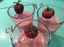 Den Shake gekühlt und mit den Schoko-Erdbeeren servieren.