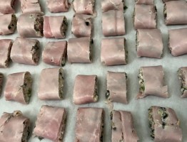 Die Masse mit einer Palette auf den Schinkenscheiben verstreichen und die Scheiben von der kurzen Seite her aufrollen.