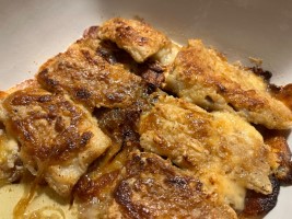 Die Zwiebeln schälen, in Ringe hobeln und mit etwas Zucker in Öl dünsten. Danach über den Kartoffeln in der Auflaufform verteilen.