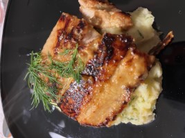 Den Lachs auf dem Stampf anrichten und mit etwas Dill garnieren.