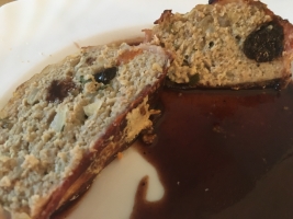 Aus dem Teig einen Hackbraten formen und die Pflaumen eindrücken. Dabei die Pflaumen für die Soße beiseite legen. Danach den Braten nochmals formen.