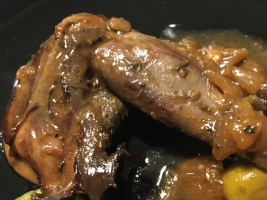 Für das »Coniglio al vino bianco« das Öl in einem Schmortopf erhitzen und die Hasenteile bei starker Hitze rundherum anbraten. Mit dem Wein ablöschen. Oliven, Thymian, zerdrückten Knoblauch, gehackte Zwiebel und Lorbeer dazugeben. Mit Salz und Pfeffer würzen und 100 Minuten im geschlossenen Topf schmoren.