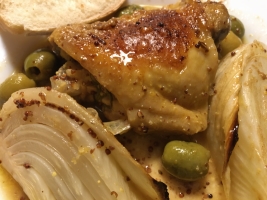 Den Inhalt des Beutels in eine Fettpfanne geben und dabei die Hühnerteile mit der Hautseite nach oben ausrichten. Die Oliven darauf verteilen und zusätzlich etwas Olivenöl auf die Hühnerteile träufeln, damit sie besser bräunen. Im auf 220°C vorgeheizten Backofen 1 Stunde garen, bis das Huhn braun und der Fenchel weich ist.