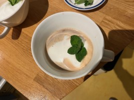 Die restliche Milch aufschäumen und auf den Kaffee geben. Mit frischer Minze garnieren.