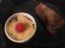 Die Hälfte des Puddings in kleine Dessert-Förmchen geben und mit dem mit Milch befeuchteten Finger glattstreichen. Danach eine Schicht eingeweichter Biskuit einschichten und mit dem Rest des Puddings bedecken.