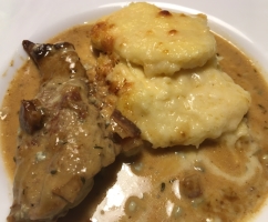 Die Soße über die Kalbsschnitzel geben und die glattgerührte Mischung aus Mascarpone und Gorgonzola darauf verteilen.
